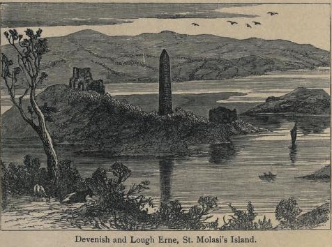 With a view to attain his cherished purpose, St. Molaise selected a charming site for the foundation of a religious establishment. At an early age, our saint fixed his habitation on the lone Island of Devenish, at the entrance to Lower Lough Erne, and about two miles distant, from the present town of Enniskillen. At what precise period St. Molaise established himself on this island cannot be accurately ascertained.