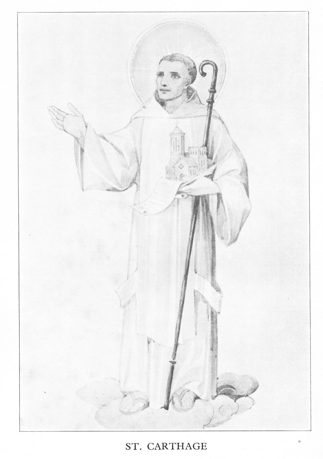 St. Carthage or Mochuda was born in vicinity of Castlemaine 564; as a boy while herding his father's flocks he forms a friendship with Maoltuile, Chieftain of Ciarraighe Luchra; at age of twelve he meets Bishop Carthage, the Elder. After some opposition on part of his father, the boy becomes a disciple of the Bishop. He makes religious profession at age of twenty, 584; is ordained priest and founds monastery of Kiltullagh 590-592. Compelled to leave Kiltullagh, he visits Bangor, where he spends a year. Various other visits. At last he founds Rahan 594-595. Spends forty years at Rahan during which he occasionally journeys to Kerry and the South. Expulsion from Rahan, Foundation of Lismore 635 or 636. Death 637.